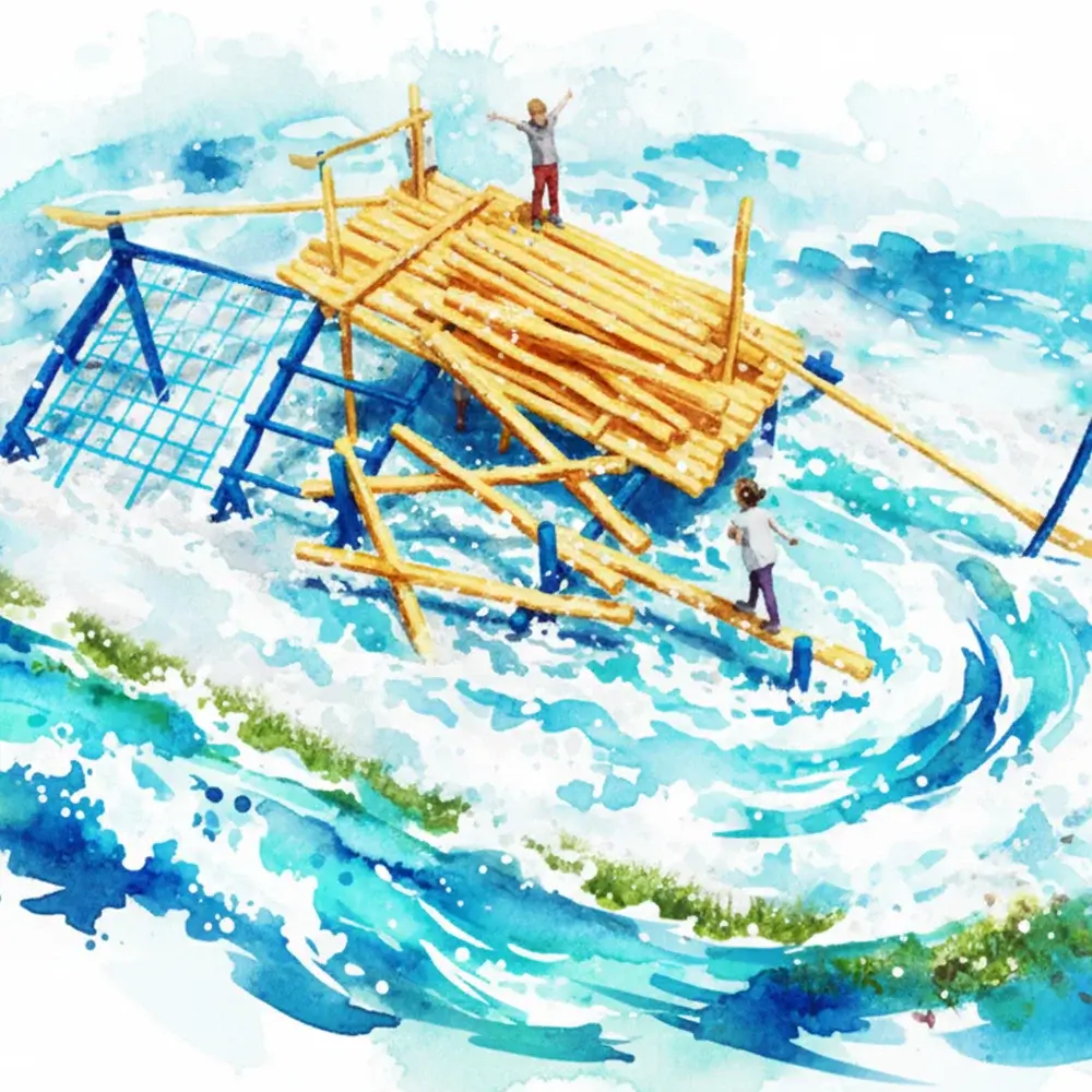 Du planst einen Spielraum, der Geschichten erzählt und Kinder wirklich erreicht? Dieses große historische Floss greift ein kraftvolles Bild aus der regionalen Flößerei auf: In den starken Stromschnellen von Loissach, Isar, Inn oder Lech verliert das Floss seine schwere Holzladung. Die Stämme geraten ins Rutschen, verkeilen sich, bleiben hängen oder treiben ab. Genau dieses Szenario wird hier zur Spiellandschaft.