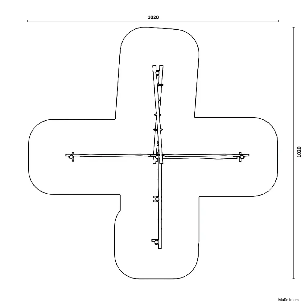 Jede Station ist präzise durchdacht und bietet verschiedene Schwierigkeitsgrade. Das zentrale Podest dient als Startpunkt und Ruhezone, während die vier Arme des Kreuzes unterschiedliche Herausforderungen bereithalten. Der Hangelstamm mit seinen sieben Edelstahlgriffen trainiert die Armkraft, das Balancierseil mit Handlauf fordert das Gleichgewicht, und der einzigartige Drehstamm bringt eine spannende Rotationsbewegung ins Spiel.